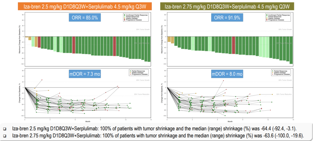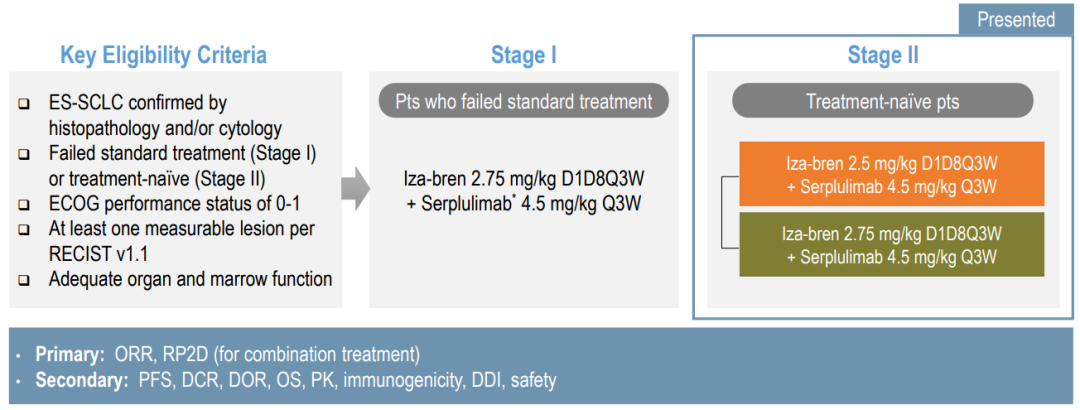 中国II期研究,该研究评估EGFR/HER3双抗ADC(Iza-bren)联合 斯鲁利单抗一线治疗初治ES-SCLC的疗效与安全性。 本研究是一项针对初治 ES-SCLC 患者的 II 期、非随机对照临床研究,分为两个研究阶段。患者入组标准包括:经组织病理学和 / 或细胞学确诊的 ES-SCLC 患者,ECOG 体能状态评分为 0-1,至少有一个可测量病灶(根据 RECIST v1.1 标准),且器官和骨髓功能充足。 本次更新的数据为第二阶段结果,共纳入 82 例来自中国的患者,并按 1:1 比例将其随机分配至不同 Iza-bren 剂量组,分别接受不同剂量的 Iza-bren 联合斯鲁利单抗联合治疗。 该研究的主要研究终点为 ORR 和推荐 II 期剂量(RP2D),次要终点包括无进展生存期(PFS)、疾病控制率(DCR)、缓解持续时间(DoR)、总生存期(OS)、药代动力学(PK)、免疫原性、药物相互作用(DDI)和安全性。 主要结果: 疗效方面,Iza-bren 联合 PD-1 抑制剂方案在 ES-SCLC 一线治疗中展现出良好疗效,总人群 ORR 高达 88.3%,中位 PFS 达 8.2 个月。尤为值得关注的是,该方案整体患者 1 年 OS 率超 80%,其中 2.5 mg/kg 剂量组达 85.7%,显著优于历史对照数据(中位 PFS:5 个月 -6 个月,1 年 OS 率为 50%-60%)。 在安全性方面,尽管研究治疗期间 TRAEs 发生率较高,但主要为血液学毒性,包括贫血、中性粒细胞减少、血小板减少等,并可通过临床支持治疗得到有效管理。因此,研究中因 TRAEs 导致的停药率总体较低(7.3%),其中 2.5 mg/kg 组仅为 2.4%,提示该方案具有良好的耐受性。 基于上述积极结果,已确定 2.5 mg/kg(D1、D8,Q3W)为 RP2D,并正在筹备中国的 III 期临床研究,计划将在 ES-SCLC 一线治疗中头对头比较 Iza-bren 联合 PD-1 单抗方案与标准 EP/EC(依托泊苷 + 铂类)联合 PD-1 抑制剂方案的疗效,并加强毒性管理,以进一步验证该联合疗法在 ES-SCLC 一线治疗中的价值。未来这些研究成果能够为 SCLC 患者带来新的一线治疗选择,并推动 SCLC 治疗格局的变革。 双抗ADC联合免疫方案,在小细胞肺癌后线治疗中证实显著疗效。